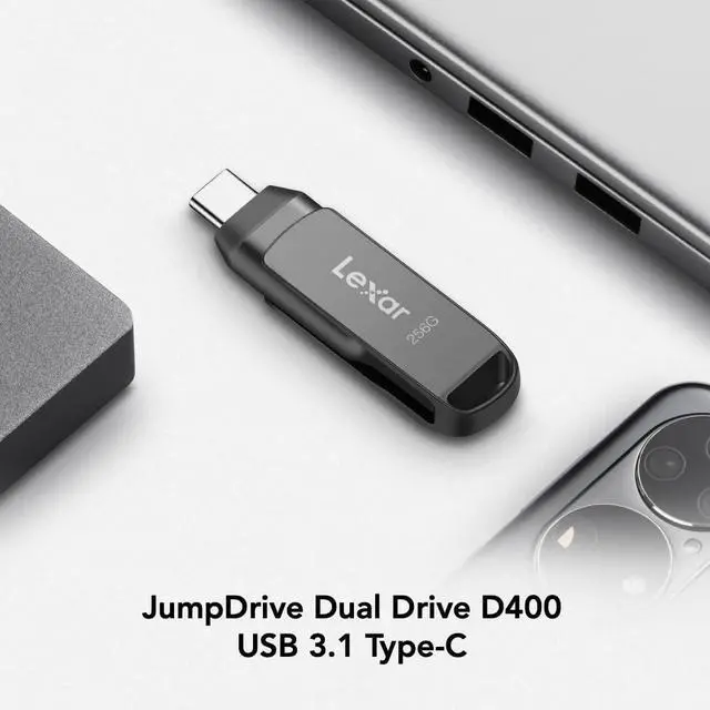 The Lexar JumpDrive Dual Drive D400 USB 3.2 Gen 1 Type-C is a 2-in-1 flash drive that allows you to seamlessly transfer content between your USB Type-C and Type-A devices. Featuring a stylish metal casing and swivel design for added protection, this drive is as tough as it is fast with transfer speeds up to 130MB/s.