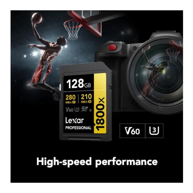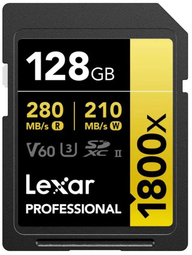 Lexar Gold Series Professional 1800x 128GB UHS-II U3 SDXC Memory Card U3) and Video Speed Class 60 (V60) for your professional DSLR and mirrorless cameras Leverages UHS-II technology to deliver read speeds of up to 270 MB/s Captures high-quality images and extended lengths of Full-HD video and 4K with write speeds up to 180 MB/s Designed for durability.
