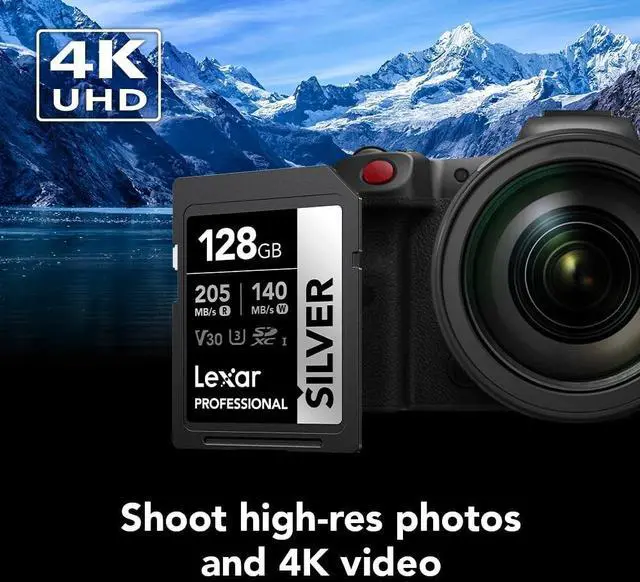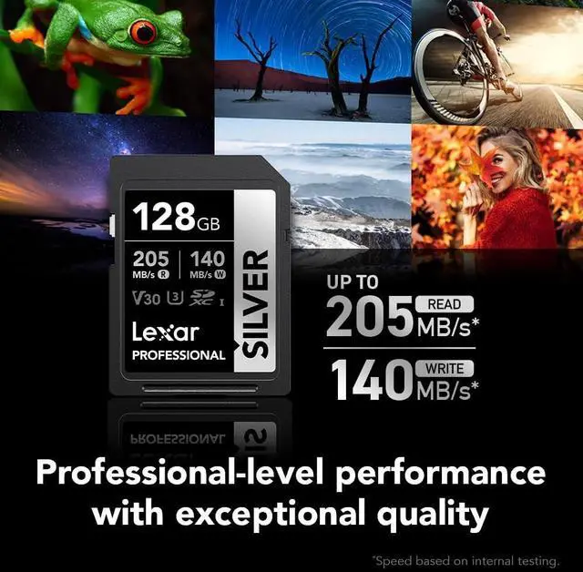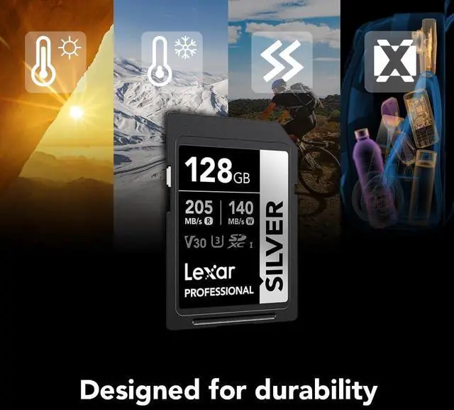 The Lexar Professional SILVER SDXC UHS-I Card delivers 205MB/s max read and 140MB/s max write speeds to help you capture better photos and videos and to accelerate your workflow. Rated V30, it records 4K video at 60FPS for stunning, stutter-free footage. Its temperature-, x-ray-, vibration-, magnetic-, shock-, wear-, and drop-proof and it comes with a lifetime limited warranty for maximum peace of mind.