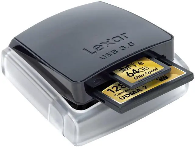 The Lexar Professional USB 3.0 Dual-Slot Reader is a professional-level, portable USB reader that leverages SuperSpeed USB 3.0 technology to deliver blazing-fast transfer speeds from card to computer, with a USB interface speed up to 500MB/s (reads up to 5 times faster than USB 2.0 ). It lets you leverage the performance capabilities of the latest UDMA CompactFlash (CF) (including UDMA 7 CF 6.0 ) and SD, SDHC, SDXC, and SD UHS-I (SD 3.0 ) memory cards. The reader is also compatible with standard CF and SD cards and USB 2.0, and includes a five-year limited warranty.