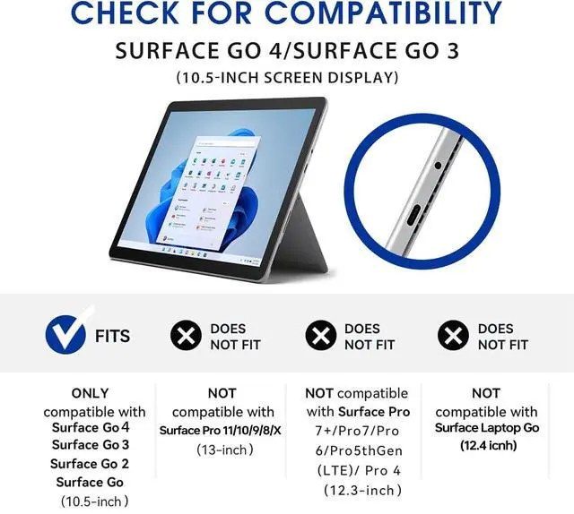 Exclusively designed for Microsoft Surface Go 4 (2023 released)/Surface Go 3 (2021 released)/Surface Go 2 (2020 released)/Surface Go (2018 released); NOT compatible with any other devices(Keyboard not included), also Not Fit Microsoft Surface Go Laptop 12.4-inch.