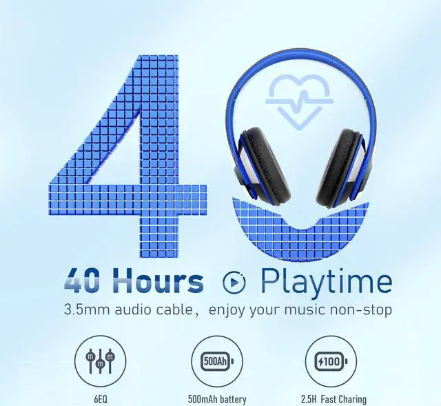 40 Hours Long Playtime with 6 EQ Modes - Our Wireless Headphones have 6 EQ modes with which you can freely switch between Bass/Jazz/Voice/Rock/Pop/Classic sounds, each mode provides you with the CD quality sound. 500mAh battery, 40 hours of playtime, 2.5 hours Fast Charging. The wireless headphones come with a 3.5mm audio cable, meaning you can switch to wired mode and enjoy your music non-stop. Whether you want wireless headphones or wired headphones, Bluetooth headphones have you covered.