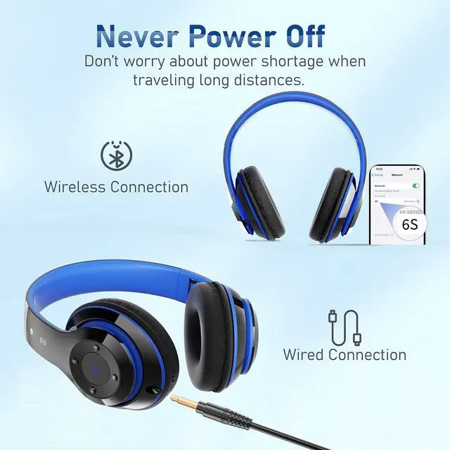 Bluetooth Headphones Over Ear, 6S Foldable Wireless Headphones with 6 EQ Modes, 40 Hours Playtime HiFi Stereo Headset with Mic, Soft Ear Pads, TF/FM for Cellphone/PC/Home (Black & Blue)