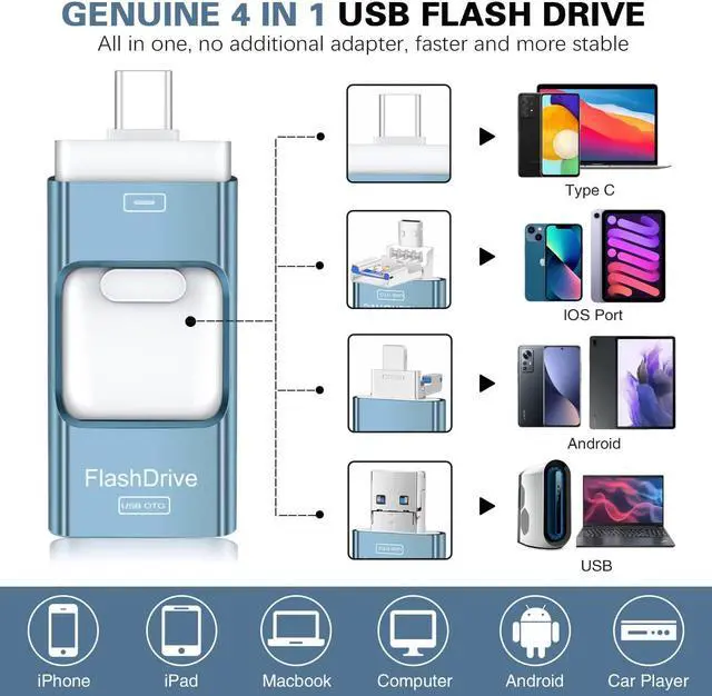 128GB 4 IN 1 PHOTO STICK - High quality aluminum frosted ZARMST usb c flash drive comes in a true 4 IN 1 Design, it has 4 built-in ports (USB-C, iPhone Port, Micro USB and Standard USB A Connector) with no additional adapters to make it more stable.