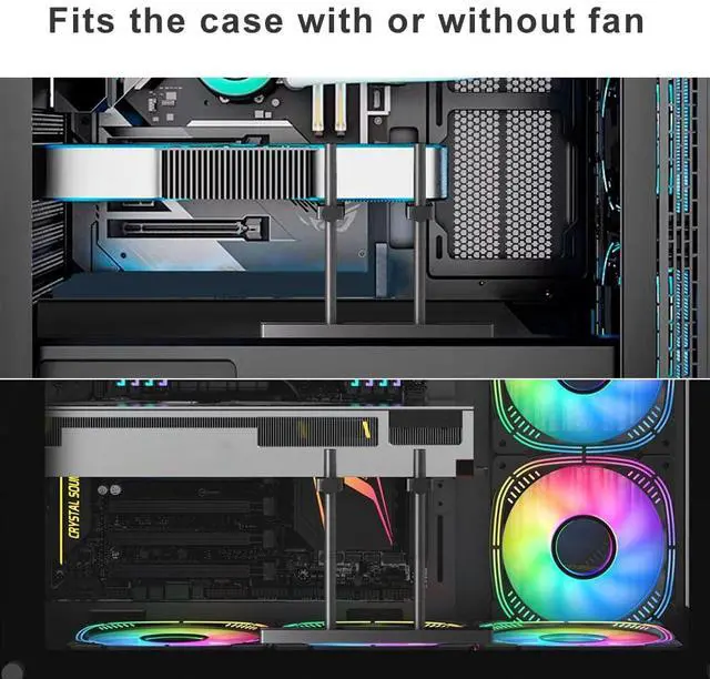• Easy to Install and Widely Compatibility: the bottom of the GPU bracket is slidable,and the height is adjustable. you can DIY the height and placement location to meet your requirements, it is universal for various chassis like ATX, MATX and ITX etc. it can fix on your bottom fan (12 or 14cm fan) by screws, and without blocking vent.