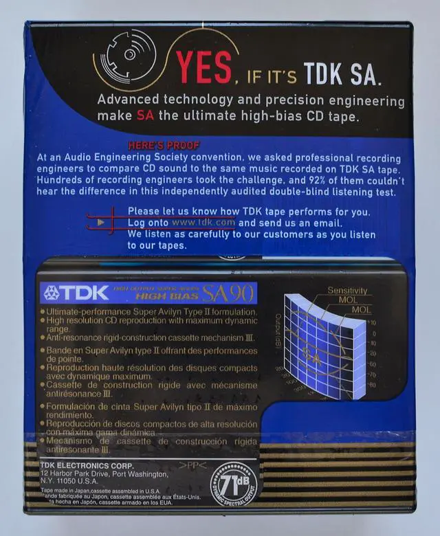 These tapes use an ultrafine, Super Avilyn Type II, high-bias cobalt formulation with high-density packing and uniform orientation. They offer exceptionally high resolution CD reproduction with maximum dynamic range, and very low noise, which makes them ideal for taping from a wide variety of music sources, including CDs. The TDK SA90 tape employs the advanced AR-RC III mechanism for superior rigidity and reduced modulation noise, and is especially recommended for use in home component systems, high-performance portables, and car stereos. This is a pack of 10 SA90 high bias audio cassette tapes.