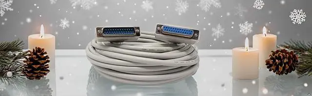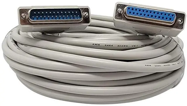 50 feet long ^^ DB25 male connector on one end and DB25 female connector on the other end ^^ Straight-through (Not a NULL modem cable) ^^ ROSH compliant ^^ 1 Year Limited Your Cable Store Warranty