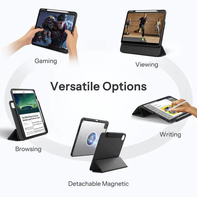 Adjustable Stand: Customize your iPad experience with 5 unique use modes. The detachable magnetic case provides hands-free viewing, reading, or typing experiences, and the clear back case can be easily to detach for ergonomic comfort during cooking or gaming ^^