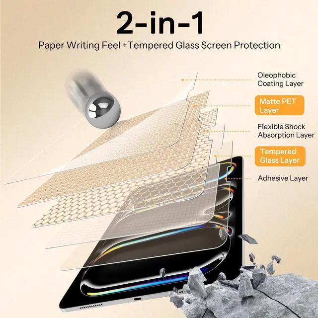 Anti-Glare & Anti Fingerprint: Matte surface diffuses light to reduce glare and ease eye strain, ideal for comfortable outdoor viewing and working. And the hydrophobic and oleophobic layer reduce fingerprints and grease residue, attain a clear screen ^^ Anti-Scratch & Shockproof2-in-1 design delivers tactile paper-like writing combined with robust impact protection. Made from 9H hardened glass to withstand scratches, drops, and daily use. Full-edge coverage ensures your iPad Pro 13 stays fully protected