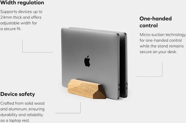 The laptop stand has two adjustable slots - compatible with tablets. eReaders & laptops (up to 2 cm = 0.8 inches thick) hand-polished solid oak wood solid steel base - double laptop dock is stable & safe one-handed operation - micro-suction technology lined with soft felt, which prevents scratches unique geometric design. Make your desk organized and comfortable - choose a multifunctional dual vertical stand, which allows you to store all of your favorite devices! Handcrafted in solid walnut or oak wood, polished by true woodworking enthusiasts.