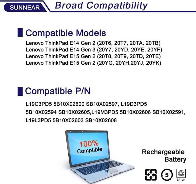 1Replacement for for Lenovo ThinkPad E14 Gen 2 (20T6, 20T7, 20TA, 20TB)series, 2for Lenovo ThinkPad E14 Gen 3 (20Y7, 20YD, 20YE, 20YF)series, 3for Lenovo ThinkPad E15 Gen 2 (20T8, 20T9, 20TD, 20TE)series, 4for Lenovo ThinkPad E15 Gen 2 (20YG, 20YH, 20YJ, 20YK) series.