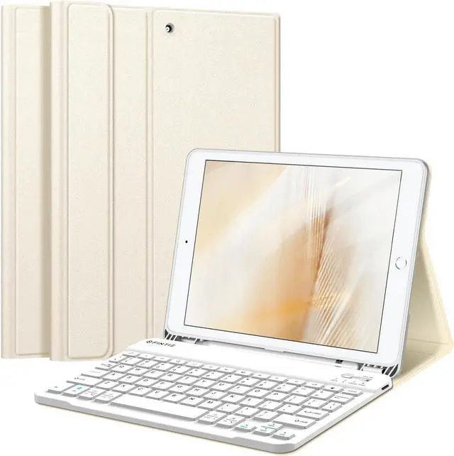 This case comes with a detachable bluetooth keyboard that seamlessly connects with the iPad for a quicker and more comfortable typing. A spring mechanism underneath each key ensures a tactile response with every stroke, helping you to type faster and with less error than on a touchscreen. Slim shell design adds maximum protection with minimal bulk ( 0.38 in). Find the angle in landscape mode just right for you with the adjustable stand that customizes to your personal viewing preference. All features of the iPad are accessible even with the case on. With built-in Apple Pencil holder, you can grab your Apple Pencil effortlessly whenever you want, easily to carry your Apple pencil with your device.