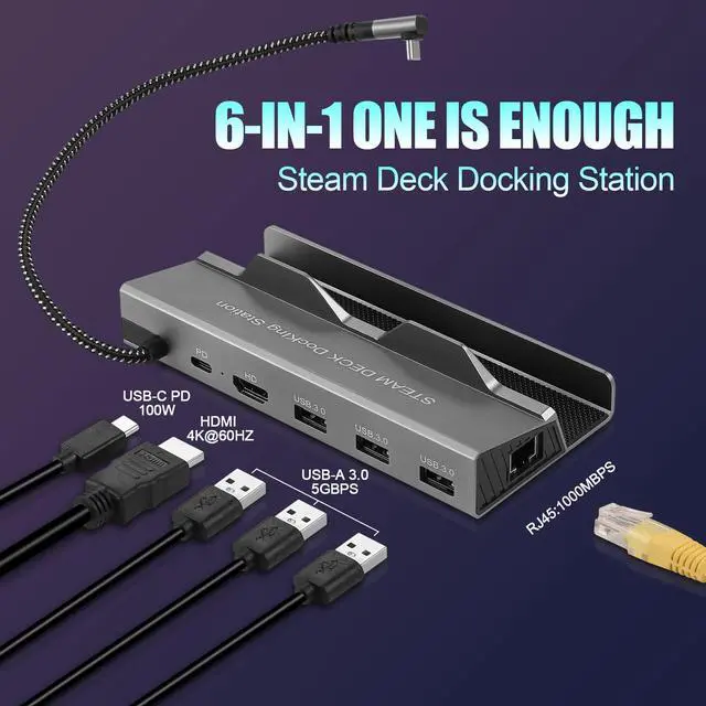 Steam Deck Dock 6-in-1: The steam deck dock is equipped with your steam deck usb type c 6 ports: 1*HDMI 2.0(4K@60Hz)output, 1*A Gigabit Ethernet(1000Mbps), 3*USB-A 3.0 ports(5Gbps) and 1*USB Type-C PD fast charging port(100W). This steam dock provides everything you need to charge your Steam Deck and ROG Ally, connect to peripherals, and stream to a larger screen. Note: NOT compatible with Protective Case with Kickstand, please make sure the thickness of the protective case is less than 2mm