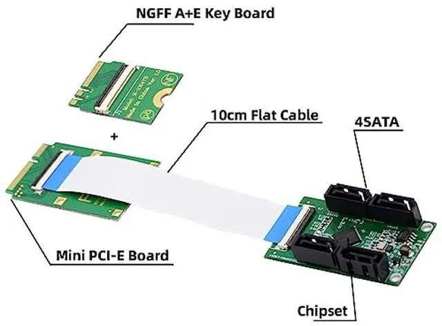 The adapter supports from Mini PCI-E PCI Express or NGFF A+E Key host to 4SATA target disk.