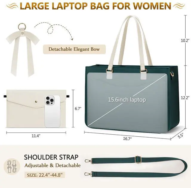 FASHION-FORWARD LAPTOP BAG FOE WOMEN: Modern fashion look combined with a detachable sophisticated bow creates a timeless yet trendy aesthetic, effortlessly versatile for any outfit or occasion. 4 metal feet on the bottom ensure this laptop tote bag stand upright and keep its shape perfectly, making this bag looks more elegant