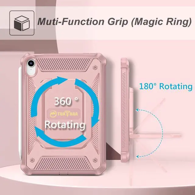 Revolving Stand: Patented Magic Ring 360deg rotating design allows you to adjust the your iPad Mini 7/Mini 6 tablet to almost any vertical and horizontal viewing angles securely.