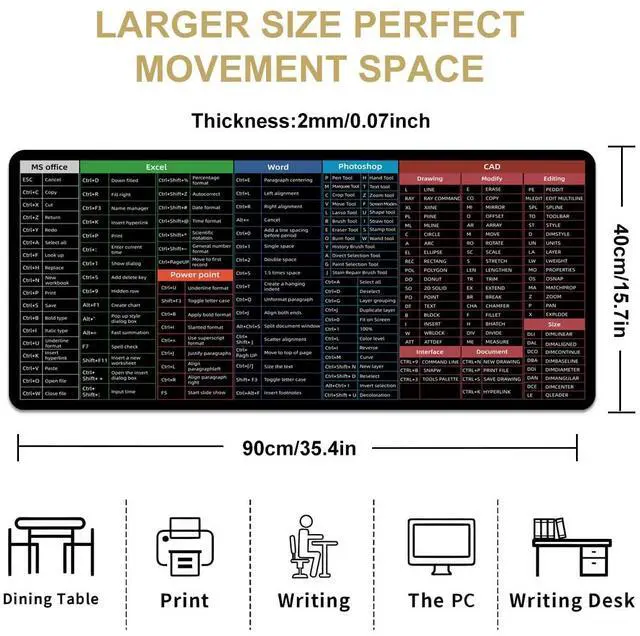 Boaulee MS Office/Excel/Word/Photoshop/CAD/Office Sheet Desk pad, Windows Large Gaming Office PC Mouse pad, Keyboard Shortcuts Mouse pad, Non-Slip Waterproof Desk mat, XXL 35.4 x 11.8 in -TS1059