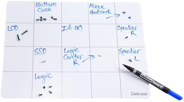 Delcast MT02 Magnetic Mat helps keep screws organized during disassembly of electronic devices. Dry erase surface allows the user to jot down notes during disassembly, such as the original location of screws or which step they resulted from. Fabricated with a thick, non-slip foam backing for additional protection from loss of screws. Includes one dual color dry erase marker.