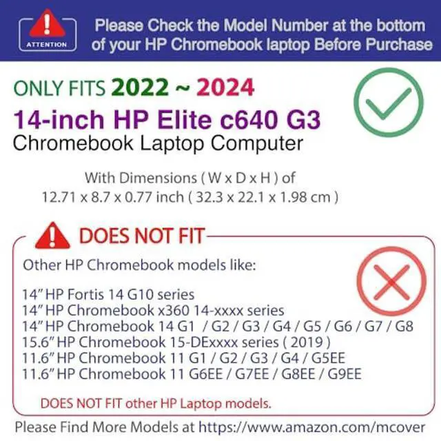 Designed to perfectly fit the 2022~2024 14-inch HP Elite c640 G3 Chromebook laptop with dimensions (w x d x h) of 12.71 x 8.7 x 0.77 inch ( 32.3 x 22.1 x 1.98 cm )