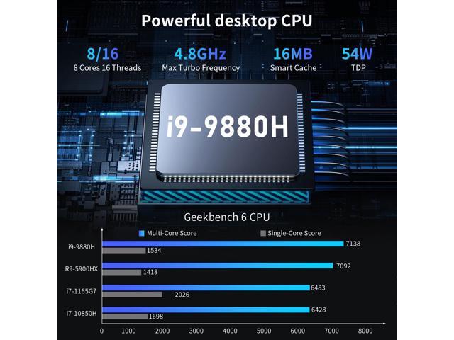 High Performance: Mini PC equipped with Core i9-9880H processor and UHD Graphics 630, 8 cores 16 threads, 16M smart Cache, base frequency: 2.3GHz, max 4.8GHz. and MAX 45W TDP that takes processing speeds and energy efficiency to new heights. Pre-installed with Windows 11 Pro (64bit) OS, Also supports Linux OS. This Mini PC is ideal for diverse usage scenarios such as entertainment, games, design, office, online education, industry, etc.