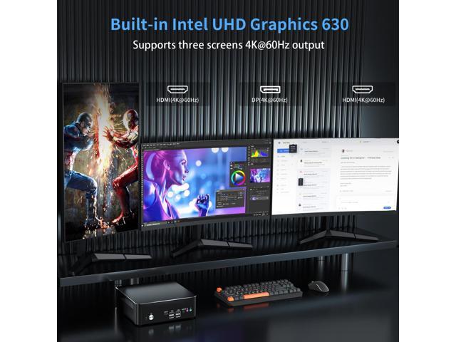 4K Three Screen Output: Mini PC equipped with UHD Graphics, You can connect three display at the same time via the 2 x HDMI+DP ports, all support 4K@60Hz. In high-d