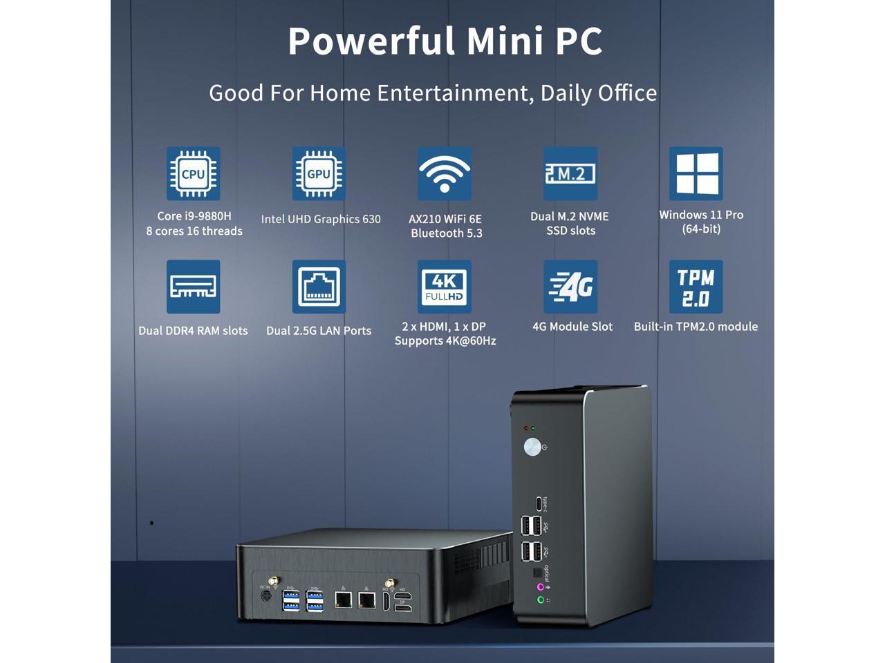Kinupute Mini PC i9, Desktop Computer Core i9-9880H 8 cores, Windows 11 Pro, TPM2.0, 32G DDR4, 1T NVME SSD, DP/HDMI/Type-C Port, Triple Display, 4K@60Hz, Dual 2.5G LAN, WiFi 6E/BT5.3, 4G Module, VESA