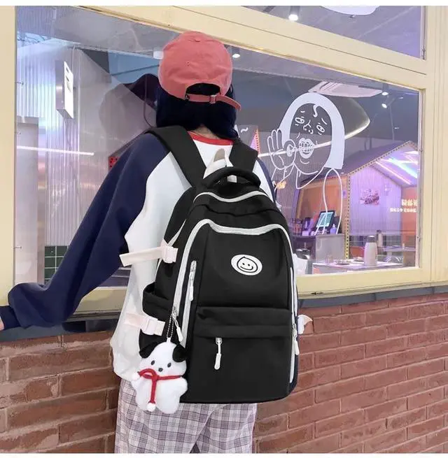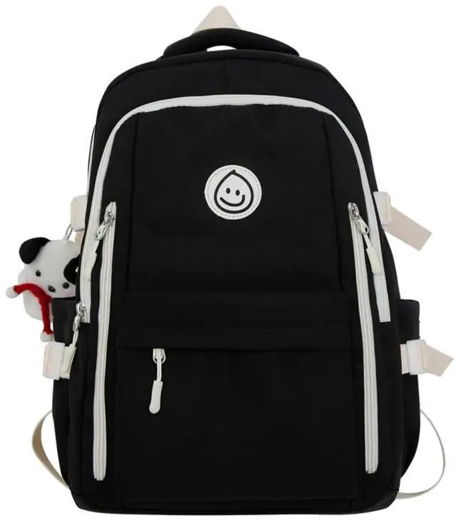 MININAI Preppy Backpack with Cute Pendant Women Smile Face Laptop Backpack Kawaii Lightweight Aesthetic College Backpack (Black, One Size)