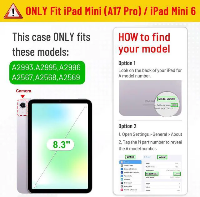 Specifically designed for iPad Mini (A17 Pro) 7th Generation 2024 (model number: A2993/A2995/A2996 ) / iPad Mini 6th Generation (2021 Model) 8.3 Inch (model number: A2567/A2568/A2569). Not fit any other iPad models. Please check back bottom of your iPad to find the model number.