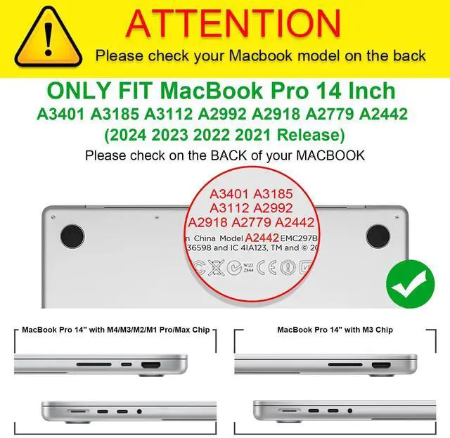 Specifically designed for MacBook Pro 14 Inch 2024 2023 2022 2021 Release A3401 A3185 A3112 A2992 A2918 A2779 A2442 M4 Max / M4 Pro / M4 / M3 Pro / M3 Max / M3 / M2 Pro / M2 Max / M1 Pro / M1 Max Chip with Liquid Retina XDR Display & Touch ID. Not Compatible with other model laptops.