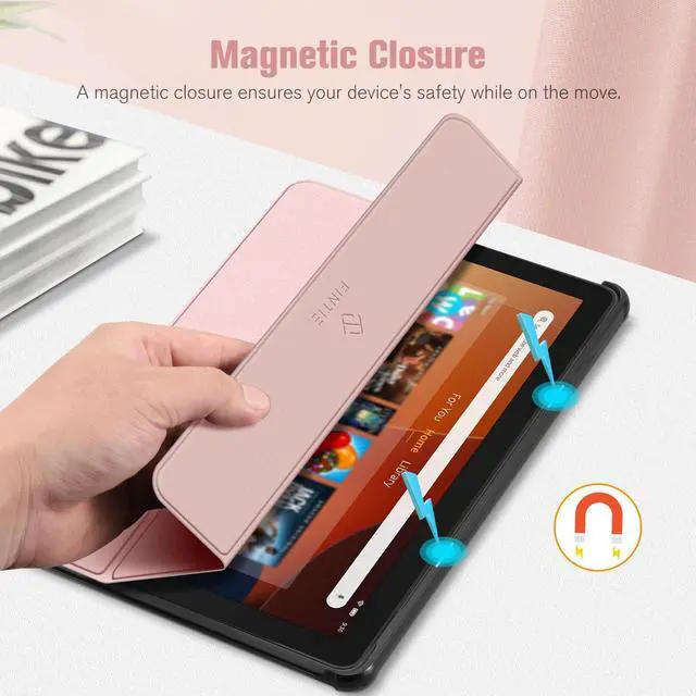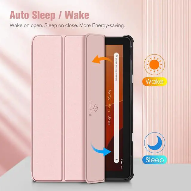 Auto Wake / SleepBuilt-in magnetic strip provides sleep / wake feature, automatically wakes or puts your 10.1 inch Fire HD 10 2023 tablet to sleep. Magnetic Closure ensures the front cover is securely closed without straps covering the front.