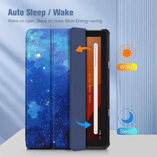 Auto Wake / SleepBuilt-in magnetic strip provides sleep / wake feature, automatically wakes or puts your 10.1 inch Fire HD 10 2023 tablet to sleep. Magnetic Closure ensures the front cover is securely closed without straps covering the front.