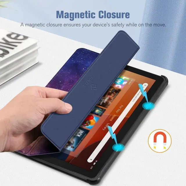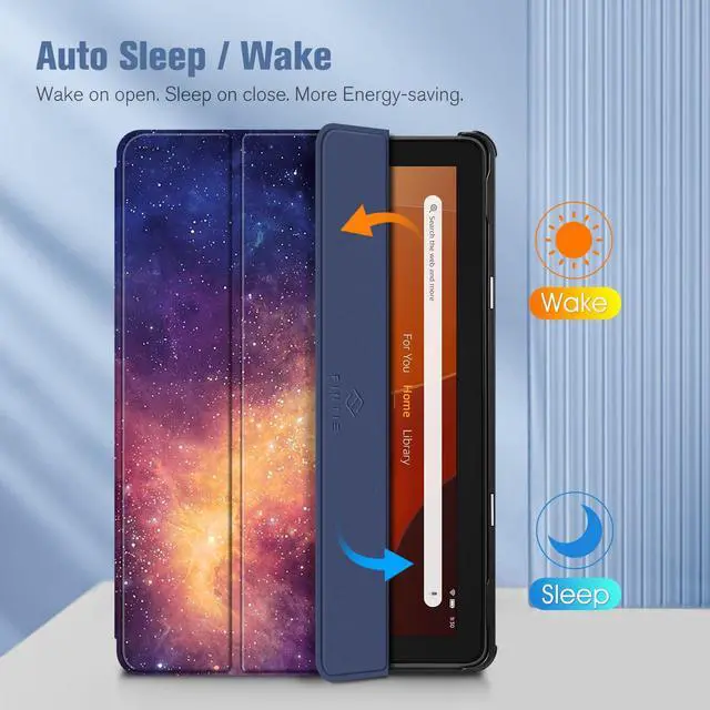 Auto Wake / SleepBuilt-in magnetic strip provides sleep / wake feature, automatically wakes or puts your 10.1 inch Fire HD 10 2023 tablet to sleep. Magnetic Closure ensures the front cover is securely closed without straps covering the front.