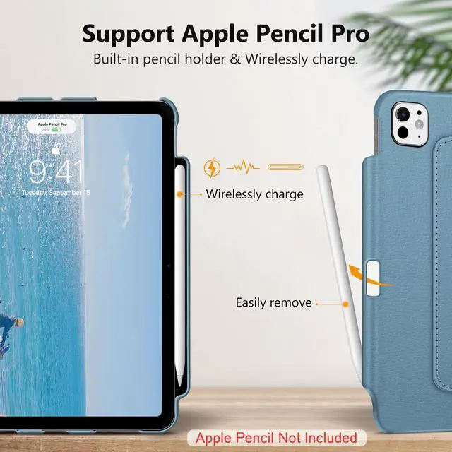 Number: A2836/A2837/A3006), not compatible with any other iPad Pro 11 Inch devices. ^^ 360 degree rotating structure in the case for flexible landscape and portrait viewing. Automatically wakes or puts your device to sleep. Snap-n-roll design-easily snaps into mount (simply snap on left side first, then right side). ^^ Seamlessly works with Apple Pencil Pro magnetic and wireless charging when case is on. Elastic band holds iPad closed securely while on the go. ^^ Built-in pencil holder, grab your Apple Pencil Pro or Apple Pencil (USB-C) effortlessly whenever you want, easily to carry your iPad pencil with your device. (Pencil not included! ) ^^ Dual Layer hard interior cover and premium synthetic leather exterior perfectly protects the device against scratches. Available in a variety of bright and fun colors. This product is covered by one or more of the following US Patent Nos. 8, 746, 449; 8, 783, 458; 9, 170, 611; 10, 139, 861.