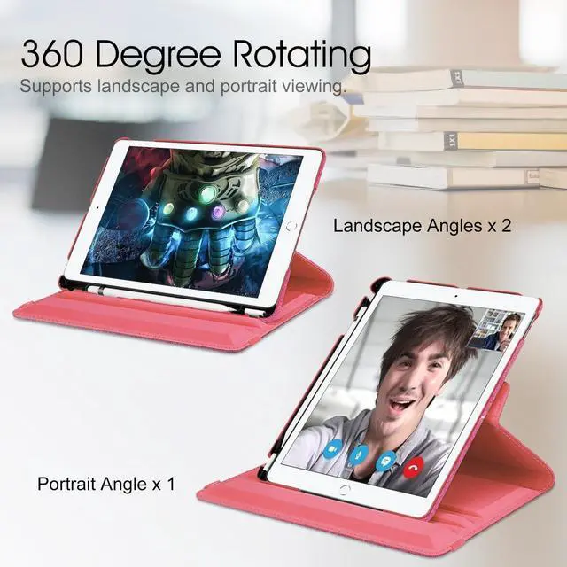 Number: A2197/A2200/A2198) 10.2" Tablet. ^^ 360 degree rotating structure in the case for flexible landscape and portrait viewing. Automatically wakes or puts your device to sleep. ^^ Snap-n-roll design-easily snaps into mount (simply snap on left side first, then right side). Dual Layer hard interior cover and premium synthetic leather exterior perfectly protects the device against scratches. ^^ Built-in Apple Pencil/Cap/Adapter slots, grab your Apple Pencil and adapter effortlessly whenever you want, easily to carry your Apple pencil with your device. Apple Pencil/Cap/Adapter not included! (NOTE: Given the design of the case, the hole has to be centered on the shell to insure proper balance while using the tablet stand and to insure proper protection of Apple Pencil, which causes the logo to be slightly off-center. ) ^^ Elastic band holds iPad closed securely while on the go. Available in a variety of bright and fun colors. This product is covered by one or more of the following US Patent Nos. 8, 746, 449; 8, 783, 458; 9, 170, 611; 10, 139, 861.