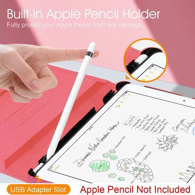 • Built-in Apple Pencil/Cap/Adapter slots, grab your Apple Pencil and adapter effortlessly whenever you want, easily to carry your Apple pencil with your device. Apple Pencil/Cap/Adapter not included! (NOTE: Given the design of the case, the hole has to be centered on the shell to insure proper balance while using the tablet stand and to insure proper protection of Apple Pencil, which causes the logo to be slightly off-center.)