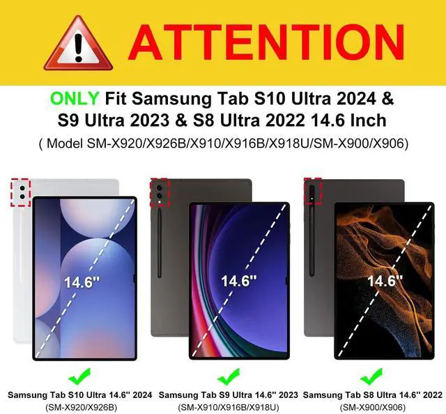 Perfect Compatibility: This case is compatible with Samsung Galaxy Tab S10 Ultra 14.6 inch (Model SM-X920/X926B) 2024 Release, Samsung Galaxy Tab S9 Ultra 14.6 inch (Model SM-X910/X916B/X918U) 2023 Release and Samsung Galaxy Tab S8 Ultra 14.6 inch (Model SM-X900/X906) 2022 Release Tablet. It will NOT work for any other model device ^^