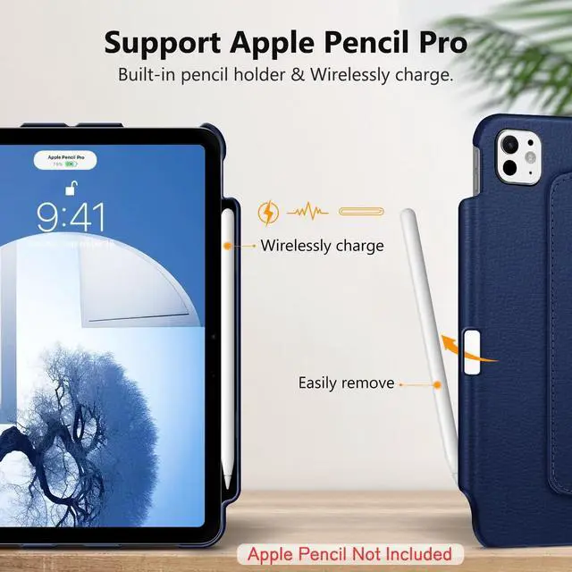 Number: A2836/A2837/A3006), not compatible with any other iPad Pro 11 Inch devices. ^^ 360 degree rotating structure in the case for flexible landscape and portrait viewing. Automatically wakes or puts your device to sleep. Snap-n-roll design-easily snaps into mount (simply snap on left side first, then right side). ^^ Seamlessly works with Apple Pencil Pro magnetic and wireless charging when case is on. Elastic band holds iPad closed securely while on the go. ^^ Built-in pencil holder, grab your Apple Pencil Pro or Apple Pencil (USB-C) effortlessly whenever you want, easily to carry your iPad pencil with your device. (Pencil not included! ) ^^ Dual Layer hard interior cover and premium synthetic leather exterior perfectly protects the device against scratches. Available in a variety of bright and fun colors. This product is covered by one or more of the following US Patent Nos. 8, 746, 449; 8, 783, 458; 9, 170, 611; 10, 139, 861.