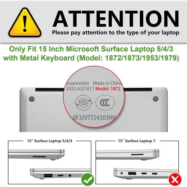 (Model: 1872/1873/1953/1979). ^^ Hard plastic case offers all-round protection for your Surface Laptop 5/4/3. ^^ Design lets you open/close your laptop all the way and access to all ports. ^^ Fully vented for safe heat disbursement. Totally removable -- easy to put on and take off.
