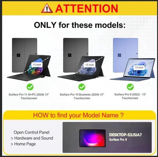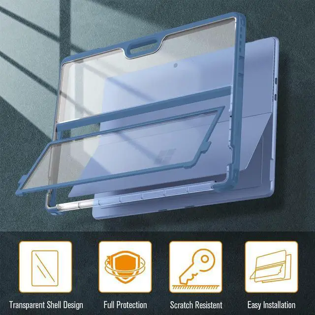 Compatibility - Designed for New Microsoft Surface Pro 11th Edition AI (2024 Release), Surface Pro 10 Business (2024 Release) and Microsoft Surface Pro 9 5G (2022 Release) 13 inch tablet ONLY. NOT FIT for 13 inch Microsoft Surface Pro 8 / Microsoft Surface Pro X, 12.3 inch Microsoft Surface Pro 7+ / Pro 7 / Pro 6 / Pro 5 / Pro LTE tablet or any other model. Works with or without the surface pro type cover keyboard (keyboard not included). (Not Compatible with Surface Slim Pen 2). ^^ Excellent Protection - Premium soft TPU and strong polycarbonate offer superb protection against daily use, durable hard case protects your surface pro 11/10/9 while it dropping from the high position, also prevent from bumps, scratches and stains.