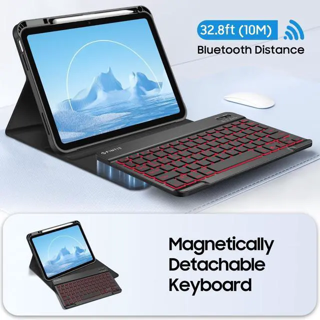 Colors Backlit Keyboard: Featured with bright backlight keyboard, 2 levels of brightness and 7 kinds of backlit makes your keyboard gorgeous and special, ensures the keys are sharp, bright and easy to read in dim light, more comfortable typing experience. Ergonomic and mechanical scissor keys with rebound feature to reduce noise, enjoy comfortable typing even long hours. Magnetically detachable super slim 7mm and light weight bluetooth keyboard with 10M wireless range. ^^ Turn Your Tablet into a
