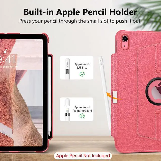 Number: A2696 / A2757 / A2777 / A3162). Not compatible with any other devices. ^^ 360 degree rotating structure in the case for flexible landscape and portrait viewing. Automatically wakes or puts your device to sleep. ^^ Snap-n-roll design-easily snaps into mount (simply snap on left side first, then right side). Dual Layer hard interior cover and premium synthetic leather exterior perfectly protects the device against scratches. ^^ Built-in Pencil slots, grab your Apple Pencil (USB-C) or Apple Pencil 1st Gen effortlessly whenever you want, easily to carry your iPad pencil with your device. (Apple Pencil not included! ) ^^ Elastic band holds iPad closed securely while on the go. Available in a variety of bright and fun colors. This product is covered by one or more of the following US Patent Nos. 8, 746, 449; 8, 783, 458; 9, 170, 611; 10, 139, 861.