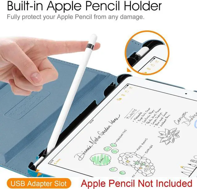 • Built-in Apple Pencil/Cap/Adapter slots, grab your Apple Pencil and adapter effortlessly whenever you want, easily to carry your Apple pencil with your device. Apple Pencil/Cap/Adapter not included! (NOTE: Given the design of the case, the hole has to be centered on the shell to insure proper balance while using the tablet stand and to insure proper protection of Apple Pencil, which causes the logo to be slightly off-center.)