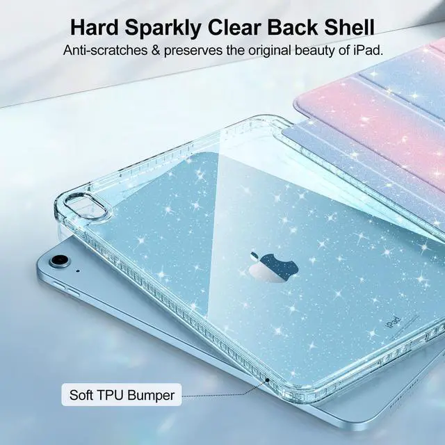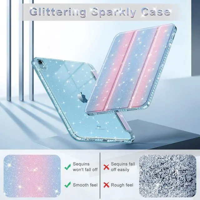 Number: A2696 / A2757 / A2777 / A3162). Not compatible with any other devices. ^^ Elevate your iPad's beauty with a stunning combination of glittering sparkly PU leather cover and a bling crystal-clear shiny back. Perfect for fashion-forward individuals, stylish women, cute kids, and anyone looking to showcase their unique style. ^^ Hardshell back cover with flexible TPU bumper protects your iPad from shocks, drops and impacts. Soft microfiber interior front prevents scratches, while the smooth PU leather resists dust and is easy to clean. Featuring embedded crystal glitter that never fades, ensuring your iPad always shines brightly. ^^ Built-in pencil Holder, grab your Apple Pencil (USB-C) or Apple Pencil 1st Gen effortlessly whenever you want, easily to carry your iPad pencil with your device. (Apple Pencil not included! ) ^^ Cover contains flip capability to transform the case into a viewing stand and keyboard stand with ease. With built-in magnets, automatically wakes or puts your device to sleep when the lid is opened and closed.