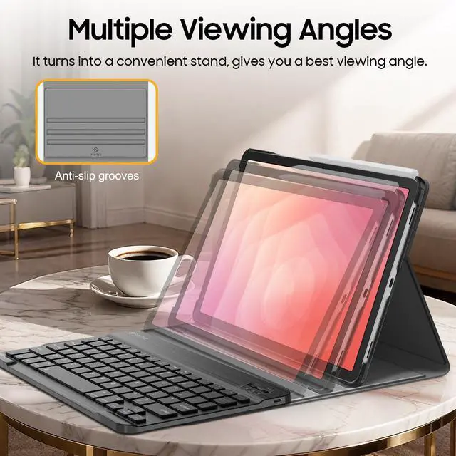 Multiple Viewing Angles: The removable keyboard is used as part of the stand for the tablet. Support 3 viewing angles and built in anti-slip grooves. Move the keyboard forward or backward along the cover of the case, you can adjust the angle of the tablet to your preference ^^