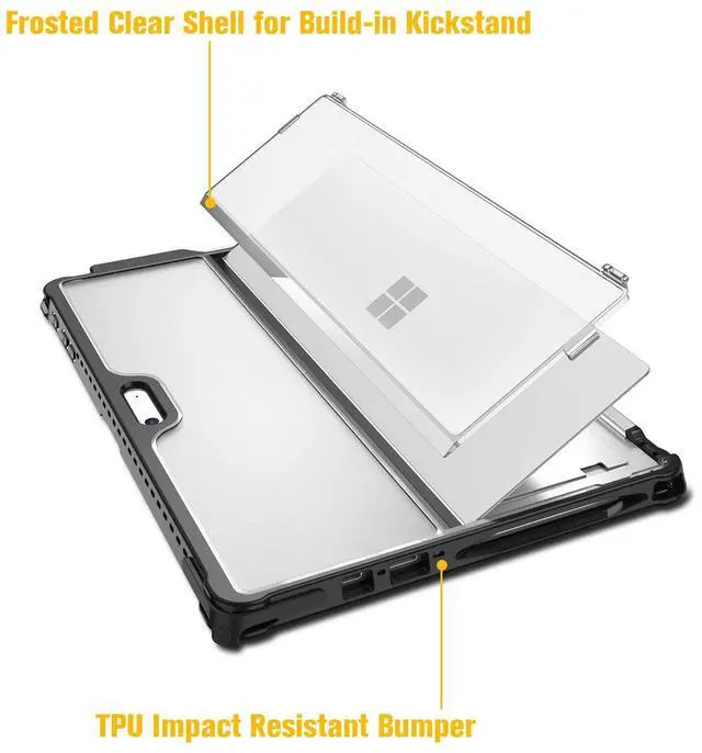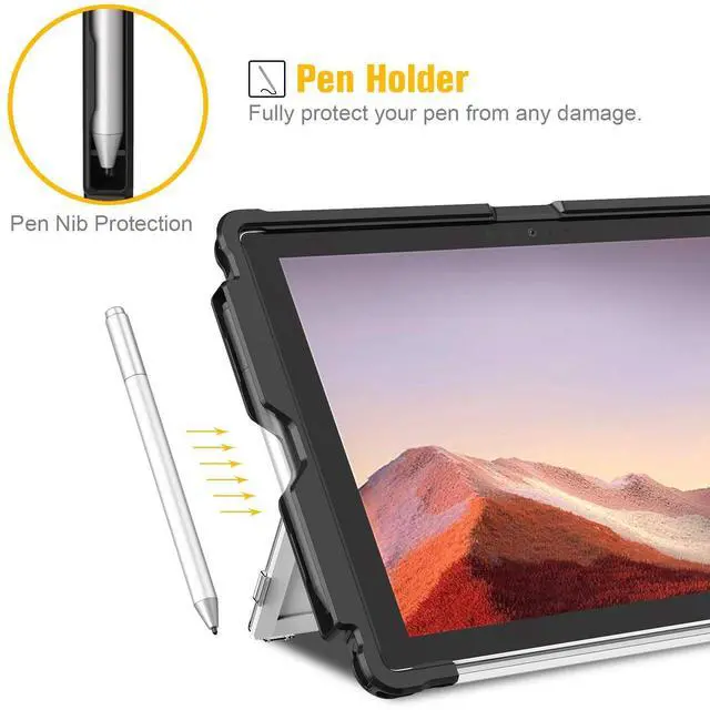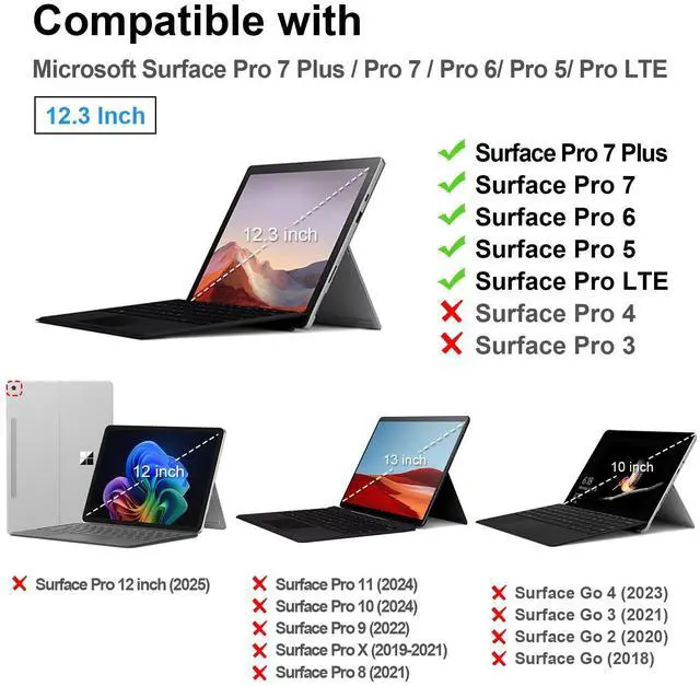 Compatibility - Designed for New Microsoft Surface Pro 7+ / Pro 7 / Pro 6 / Pro 5 / Pro LTE 12.3 inch tablet. Works with or without the surface pro type cover keyboard (keyboard not included). (Not Compatible with Surface Slim Pen 2). Not fit for the Microsoft Surface Pro 4 / Pro 3 / Pro 9 / Pro 8 / Pro X / Surface Go or any other model. ^^ Durability - Premium soft TPU and strong polycarbonate offer superb protection against daily use, the case can protect your surface pro while it dropping from the high position, also prevent from bumps, scratches.