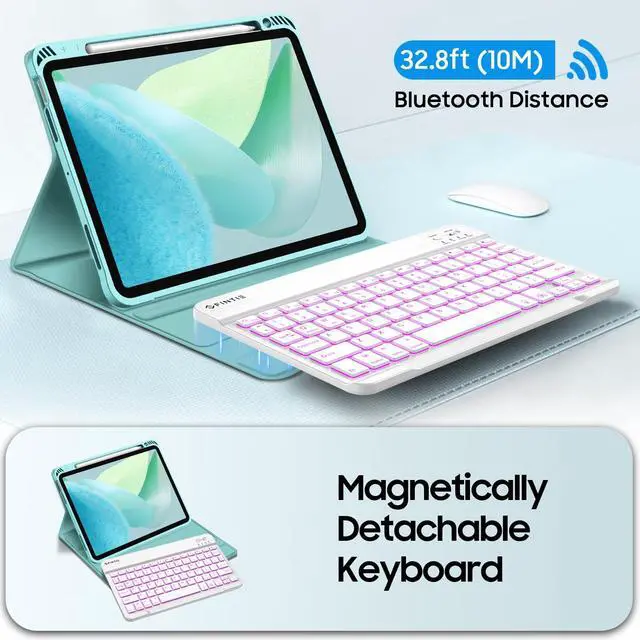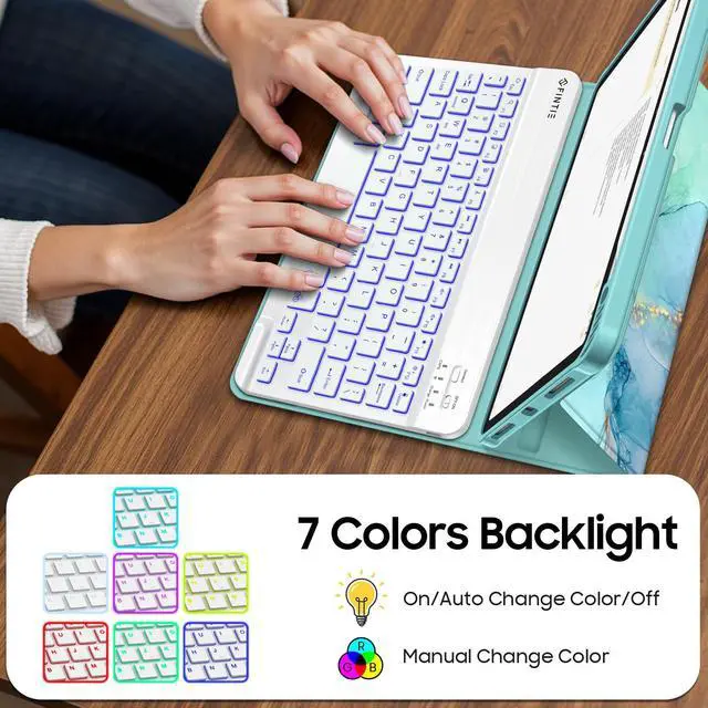 Colors Backlit Keyboard: Type comfortably in any dim light with a 7-color backlit keyboard. The bright, clear keys are perfect for low-light environments like planes, cafes, or bedtime use. Ergonomic and mechanical scissor keys with rebound feature to reduce noise, enjoy fatigue-free typing even long hours. Magnetically detachable super slim 7mm and light weight bluetooth keyboard with 10M wireless range. ^^ Dual