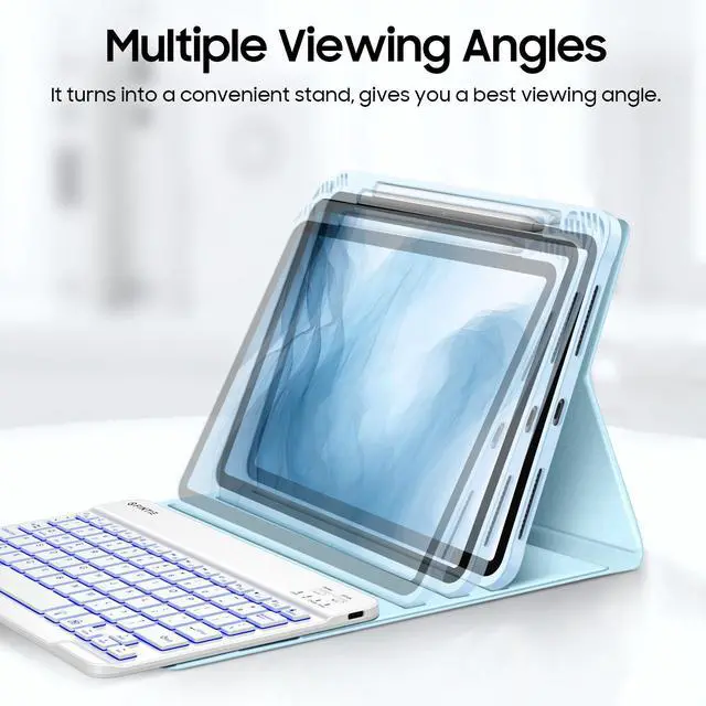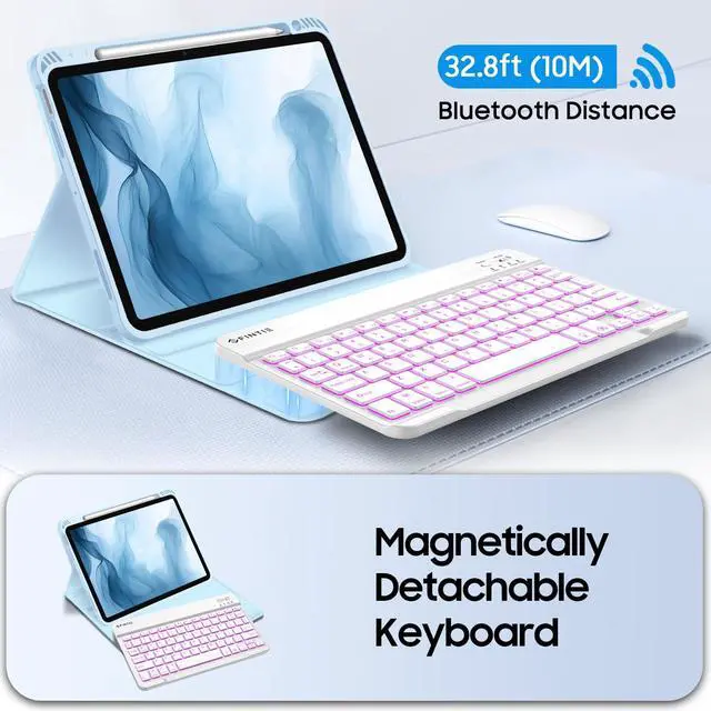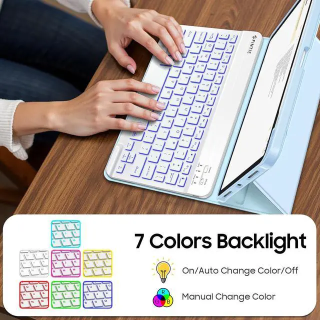 Colors Backlit Keyboard: Type comfortably in any dim light with a 7-color backlit keyboard. The bright, clear keys are perfect for low-light environments like planes, cafes, or bedtime use. Ergonomic and mechanical scissor keys with rebound feature to reduce noise, enjoy fatigue-free typing even long hours. Magnetically detachable super slim 7mm and light weight bluetooth keyboard with 10M wireless range. ^^ Dual