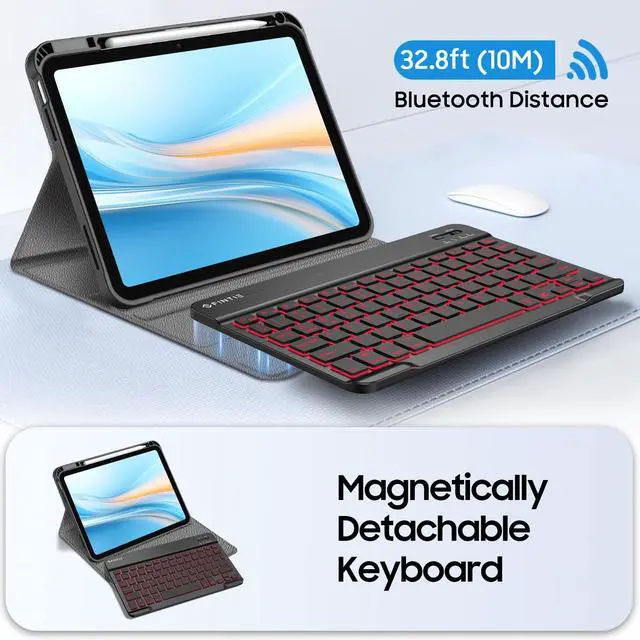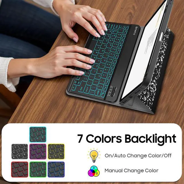 Colors Backlit Keyboard: Featured with bright backlight keyboard, 2 levels of brightness and 7 kinds of backlit makes your keyboard gorgeous and special, ensures the keys are sharp, bright and easy to read in dim light, more comfortable typing experience. Ergonomic and mechanical scissor keys with rebound feature to reduce noise, enjoy comfortable typing even long hours. Magnetically detachable super slim 7mm and light weight bluetooth keyboard with 10M wireless range. ^^ Turn Your Tablet into a