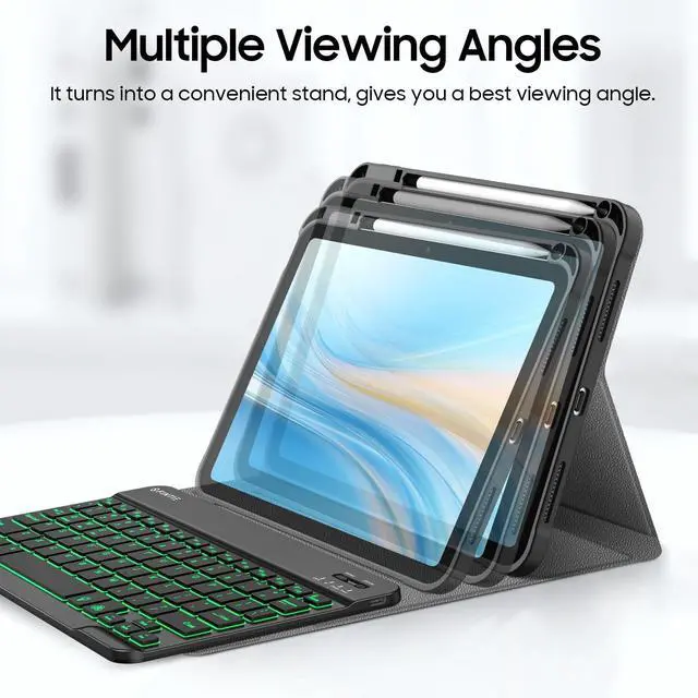 Rechargeable Battery: This iPad keyboard case features a powerful built-in 420mAh battery, delivering up to 230 hours of continuous use thanks to its energy-efficient design. The Type-C fast charging fully powers the keyboard in just 2-3 hours, eliminating the need for battery replacements. For added convenience, it automatically switches to energy-saving mode after 10 minutes of inactivity, extending standby time for worry-free usage. ^^ Adjustable 7