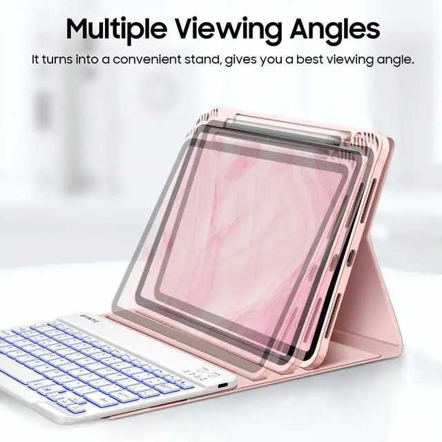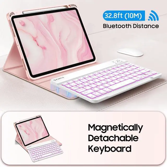 Colors Backlit Keyboard: Type comfortably in any dim light with a 7-color backlit keyboard. The bright, clear keys are perfect for low-light environments like planes, cafes, or bedtime use. Ergonomic and mechanical scissor keys with rebound feature to reduce noise, enjoy fatigue-free typing even long hours. Magnetically detachable super slim 7mm and light weight bluetooth keyboard with 10M wireless range. ^^ Dual